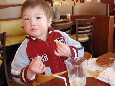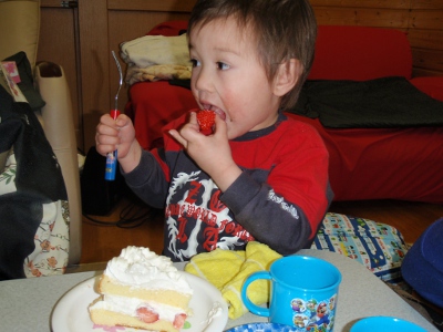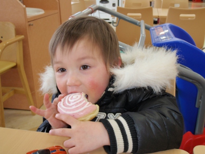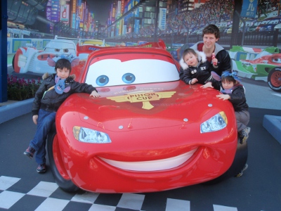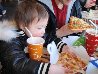 A life-sized McQueen proves somewhat intimidating | Julian makes the pizza slices look gigantic |