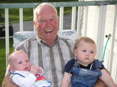 Opa holding his two Great-grandsons: Logan and Liam | That's a pretty fancy car seat you've got there! |